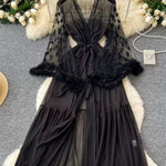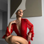 Lasă-te vrăjit de farmecul Kimono-ului Keira™ din Dantelă — un amestec visător de eleganță, romantism și seducție. Această rochie lungă și transparentă subliniază silueta ta cu o delicatețe etereală, împodobită cu detalii în formă de inimă delicate și cu manșete din pene luxoase care dau viață fiecărui tău mișcări.